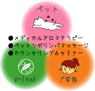 メディカルアロマテラピーとツボリンパマッサージを使った家庭でのケア方法がメインとなります。 これらのセラピーはペットにはもちろんですが、ご家族で一緒にお使いできるものばかりです。楽しく学びペットご家族・ご自身をもケアすることで病気という重いイメージを温かいコミュニケーションケアライフへとつなげます。 p-leafではカウンセリングを重視し、ペットと飼い主様の意志を尊重したうえで、分かりやすい説明を心がけてお伝えしております。